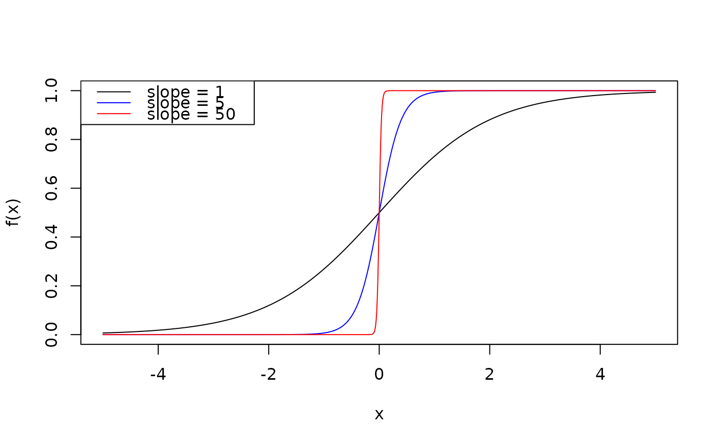 legend("topleft", legend = c("slope = 1", "slope = 5", "slope = 50"),